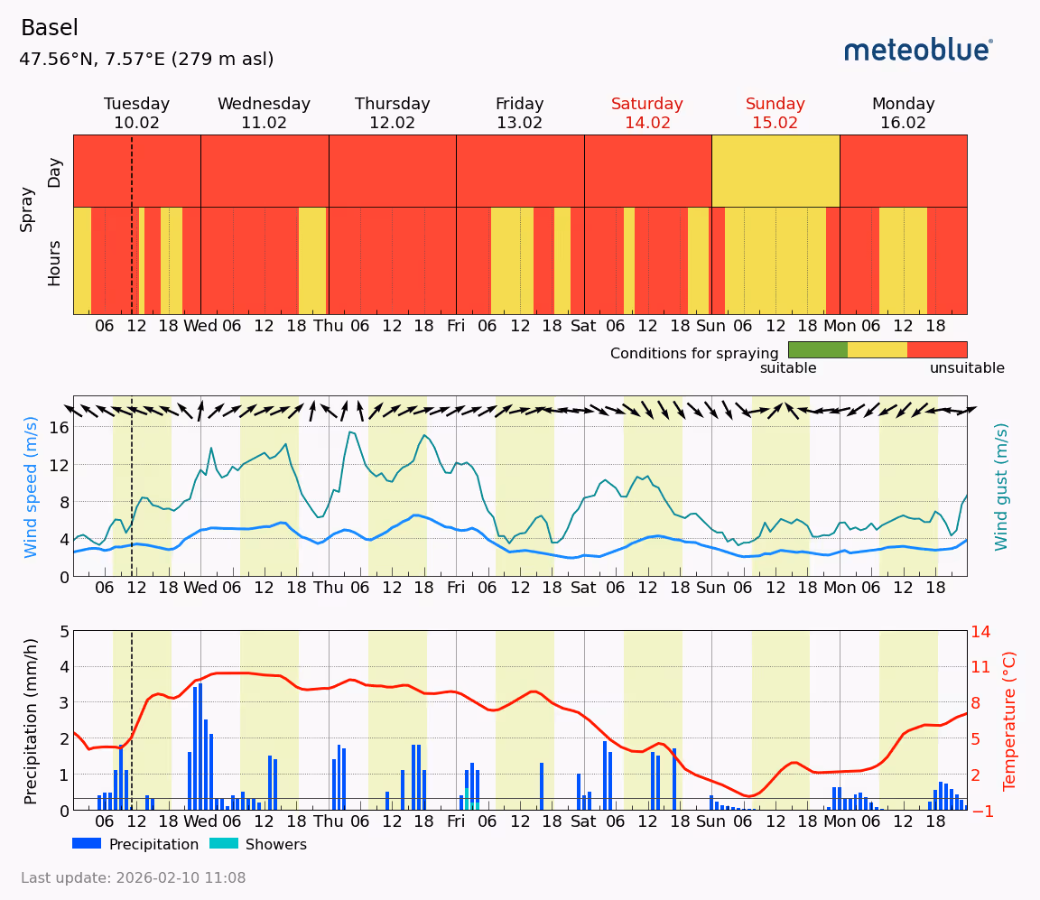 In-season farming operations are time-sensitive and resource-intensive. Applying expensive products like pesticides or fertilizers at the wrong time—just before a rainstorm or during high winds—leads to waste, environmental impact, and reduced effectiveness. Utilise our automated implementation of nowcasting on all forecasts retrieved through the meteoblue weather API improve timing.
