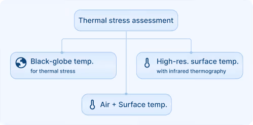 We use a range of measurement methods, including air and surface temperature monitoring, black-globe temperature measurements for thermal stress assessment, and high-resolution surface temperature mapping with infrared thermography.